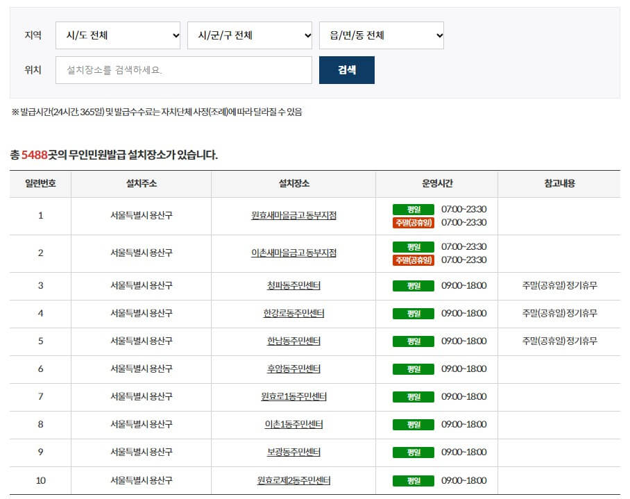 무인민원발급기 설치 장소 및 운영 시간 조회, 주말 발급 여부